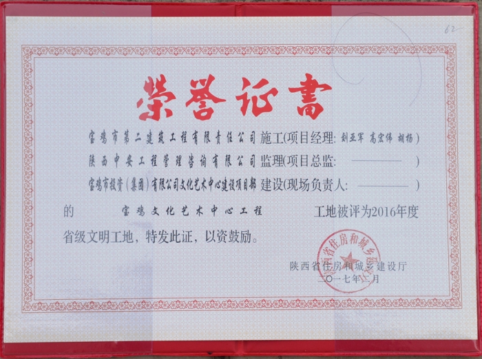 2017年度省級文明工地(寶雞文化藝術(shù)中心)