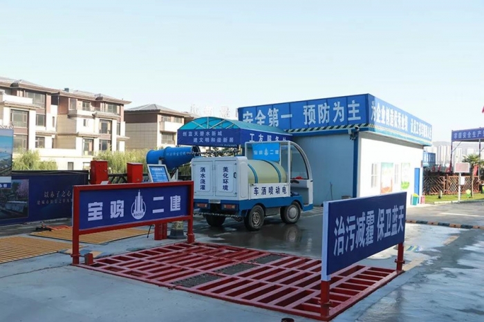 綠色施工落實到點。從公司到項目部始終將“綠水青山”的環(huán)保重責力扛在肩,積極響應,把治污減霾、揚塵防治工作作為施工內(nèi)容的重點之一。施工現(xiàn)場門口停放了灑水車和霧炮機,定期對現(xiàn)場路面進行清掃。采用圍擋、裸土覆蓋、垃圾歸類封閉、自動洗車臺等方法控制施工揚塵?,F(xiàn)場設置有環(huán)境檢測儀,與自動噴淋系統(tǒng)相連接,達到治污減霾的效果。