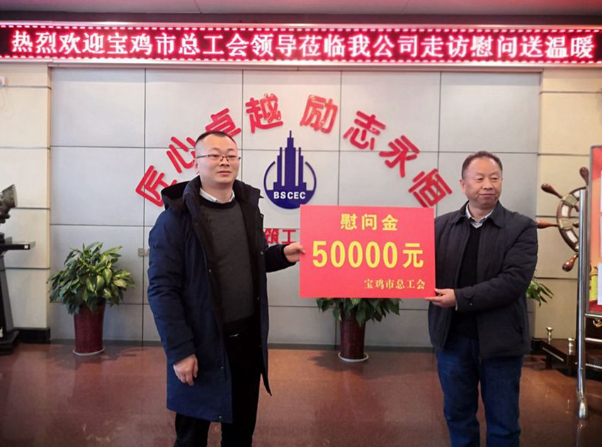 2021年1月12日下午,由寶雞市總工會(huì)黨組副書記、常務(wù)副主席趙會(huì)祥帶隊(duì)的市總工會(huì)慰問組來到我公司開展2021年“雙節(jié)”送溫暖活動(dòng),為公司送來5萬元慰問金。